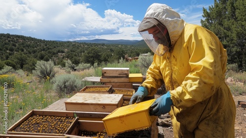 A beekeeper in protective gear inspecting hives on a honey farm