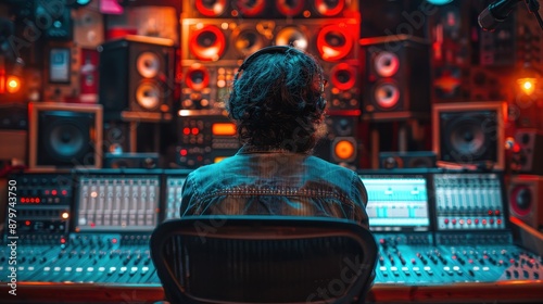 A behind-the-head view of a sound engineer sitting in front of a sophisticated mixing console and audio equipment panel, surrounded by speakers, lighting suggesting an immersive music production envi