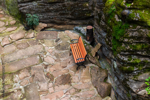 A bench beside a boulder in Qishiling, Deyang, Sichuan, China