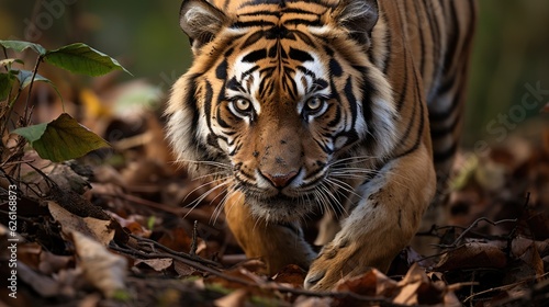 A Bengal Tiger (Panthera tigris tigris) emerging from the dense forest in India's Bandhavgarh National Park, its striped coat a striking image of regal beauty.