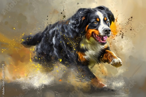A bernese mountain dog in full roar, charging forward with a fierce expression. Captured in a dynamic colours. Splashes and splatters around the dog suggest its swift movement and wild energy
