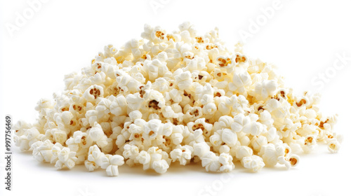 A big pile of popcorn, all by itself on a white background.