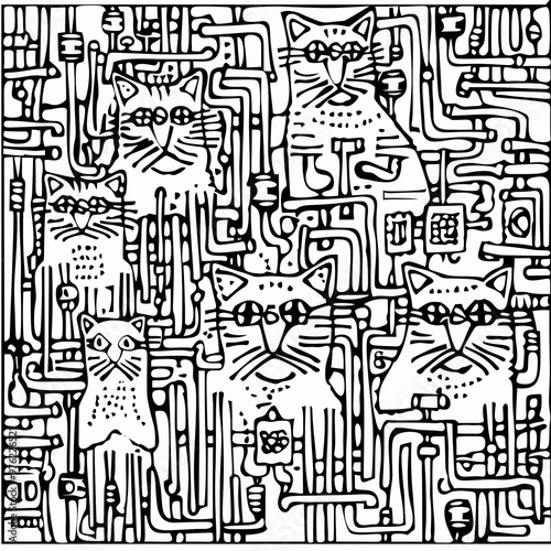 A big, plump cats depicted with delicate black strokes. A monochrome drawing intended for coloring.