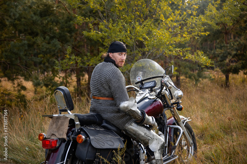 A biker in medieval knight's armor sits on a motorcycle against the background of the forest.