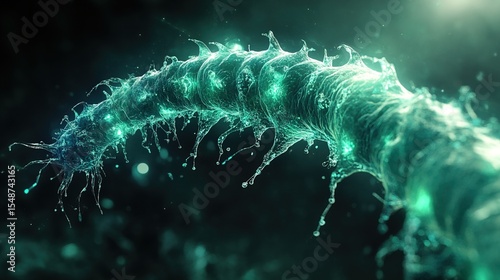 A bioluminescent DNA strand connecting to a virus cell, merging into a new species