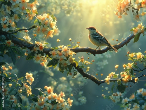 A bird is perched on a branch of a tree with many flowers