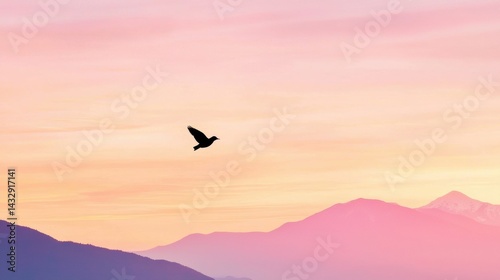 A bird soars above a mountain range at sunset.
