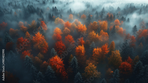 a bird's view of the Canadian forest in autumn covered by fog using an ultraviolet filter