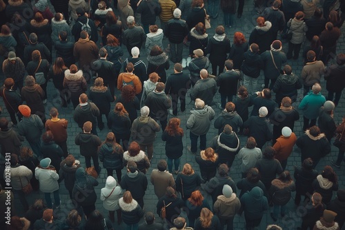 A bird's-eye perspective capturing a dense crowd of people wearing winter clothing in a public assembly