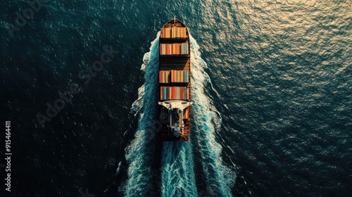 A bird's-eye view of a container ship surrounded by endless ocean, emphasizing the vastness of maritime routes.