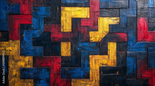 A bird's-eye view of a wooden maze with narrow paths painted in bold blue, red, and yellow, creating an abstract yet structured visual flow