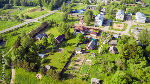 A bird's-eye view of the village on a high hill above the river on a summer day. Residential buildings and a church, a bend in the river. Colorful aerial landscape of the river coast on a summer day