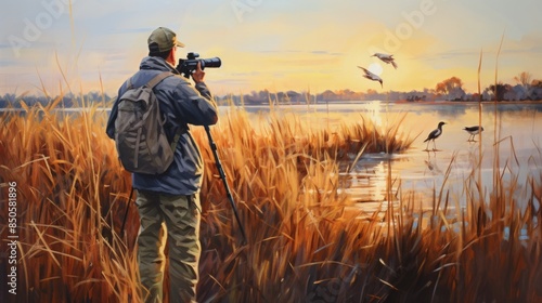 A birdwatcher with binoculars observes a colorful bird in the wetlands at sunset. Ideal for nature, wildlife, and outdoor activity promotions