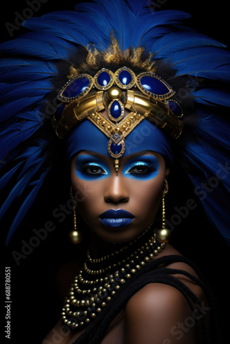 A black African woman transformed into a stunning embodiment of fantasy art, blue paint on her forehead.