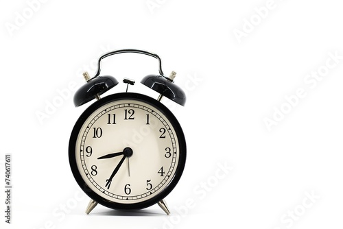 A black alarm clock with two bells on top, chrome handle, and legs, set against a white background. Timeless design meets functionality in this sleek, monochromatic timepiece..