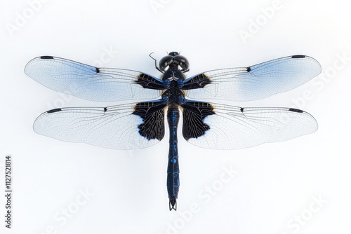 A black and blue dragonfly sits on a white surface, its delicate wings spread out