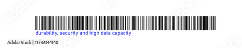 A black and white barcode with text underneath highlighting its advantages durability, security, and high data storage capacity. Vector