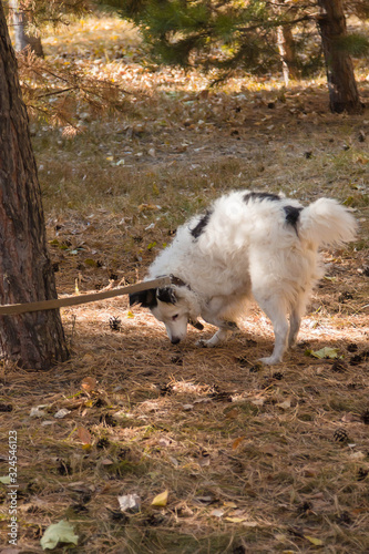 A black and white dog in a collar on a leash, walking on the lawn in an autumn park, walked to a tree.