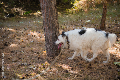 A black and white dog in a collar on a leash, walking on the lawn in an autumn park, walked to a tree.