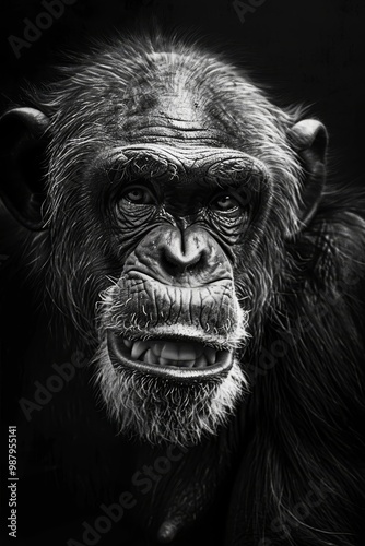A black and White Dramatic style portrait of a very old albino chimpanzee, angry and threatening, with his teeth clearly visible , dark background