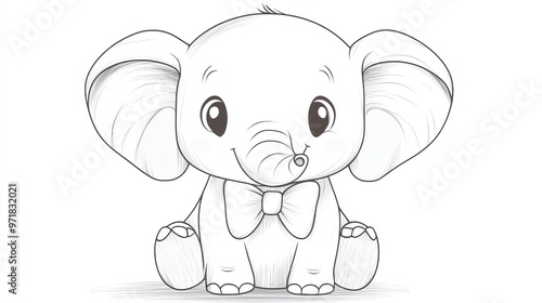 A black and white drawing of a cute baby elephant wearing a bow tie.