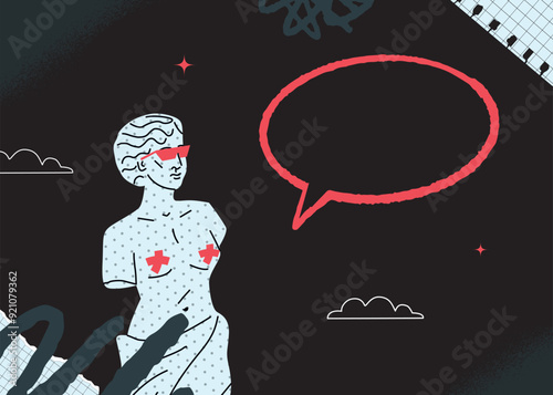 A black and white eccentric design of post or banner with a figure of Venus with strokes of red paint and an empty bubble. Vector design template