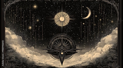 A black and white geometric compass with intricate line work, surrounded by a starry sky and crescent moon, symbolizing direction and exploration, bold contrast and sharp detailing.