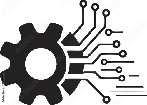 A black and white graphic shows a gear merging with circuit board lines, symbolizing the fusion of machinery and technology innovation.