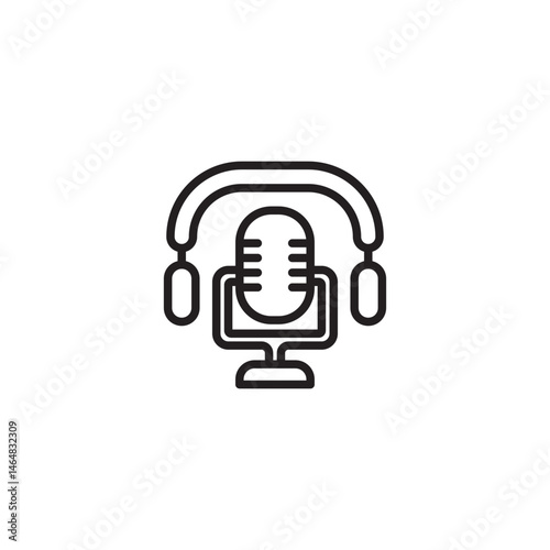 A black and white icon of headphones surrounding a retro-style microphone on a stand, representing podcasting, audio recording, or online voice communication.