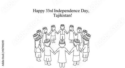 A black and white illustration celebrating Tajikistan's 33rd Independence Day, featuring children holding hands in a circle.