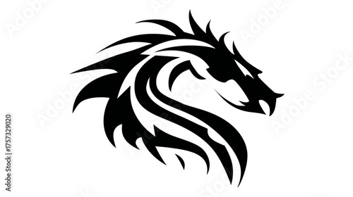 A black and white illustration of a dragon head in profile, with a stylized, tribal design