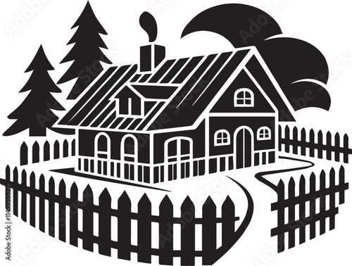 A black and white illustration of a house icon with a chimney and a slanted roof. The house is surrounded by a fence and has a path leading to it. There are trees in the background. The overall image