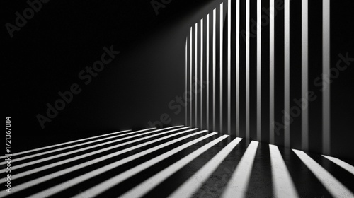 A black and white image of a room with a wall of vertical stripes.