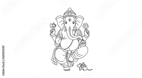 A black and white line art illustration of the Hindu deity Lord Ganesha, seated with his sacred mouse vehicle.