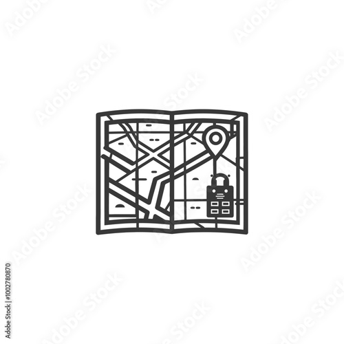 A Black and White Line Drawing of a Map with a Pin and a Padlock