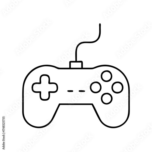 A black and white line drawing of a video game controller with a cord, isolated on a