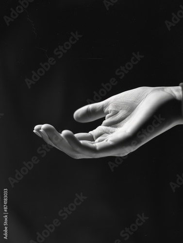 A black and white photo of a human hand stretching out to grasp an unseen object