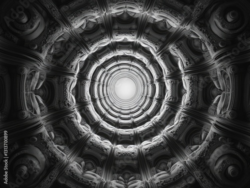 A black and white photo of a large, circular room with a white light shining through the center. The room is filled with intricate designs and patterns, giving it a sense of depth and mystery