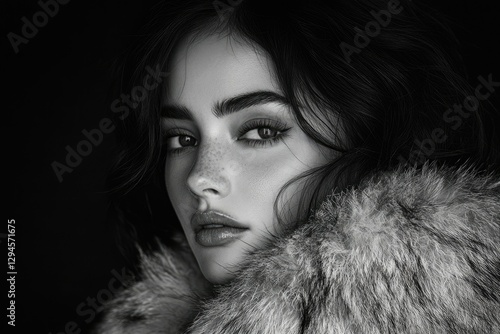 A black and white portrait of a woman with freckles, dark hair, and wearing a fur collar.