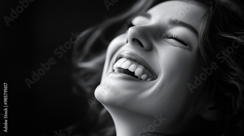 A black and white portrait of the face of an attractive woman laughing with joy