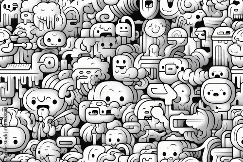 A black and white seamless pattern with various cute doodle designs including faces, eyes, and abstract shapes.