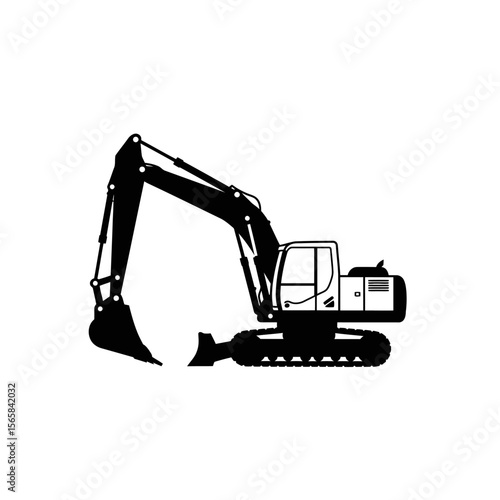 A black and white silhouette of a powerful excavator, ready for digging and construction work.