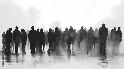 A black and white sketch of many people in the distance, standing side by side with their backs to each other, their silhouettes blending