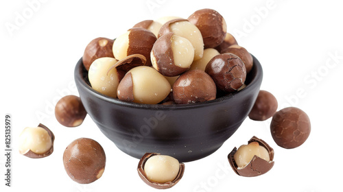 A black bowl is filled with a variety of nuts covered in rich chocolate, creating a delicious and indulgent snack