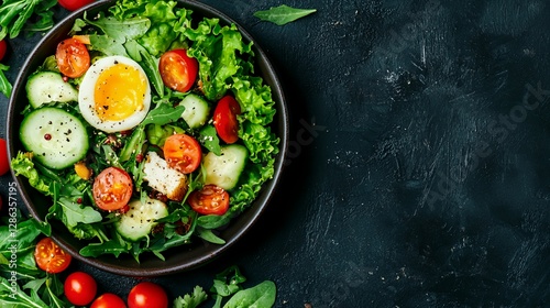A black bowl of salad with tomatoes, cucumbers, and lettuce