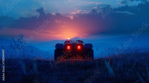 A black car is driving through a field at sunset. The sky is a mix of orange and blue, creating a serene and peaceful atmosphere. The car is the main focus of the image