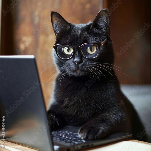 A black cat with a serious look in glasses, sitting at a laptop.