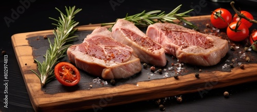 A black chopping board features fresh pork steaks seasoned with cherry tomatoes rosemary and peppercorns Copy space is available