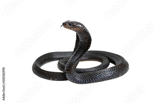 A black cobra in a defensive posture, showcasing glossy, radiating mystique and danger, isolated on a transparent background