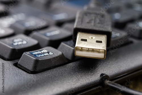 A black computer keyboard and an enlarged USB port. Computer accessories.